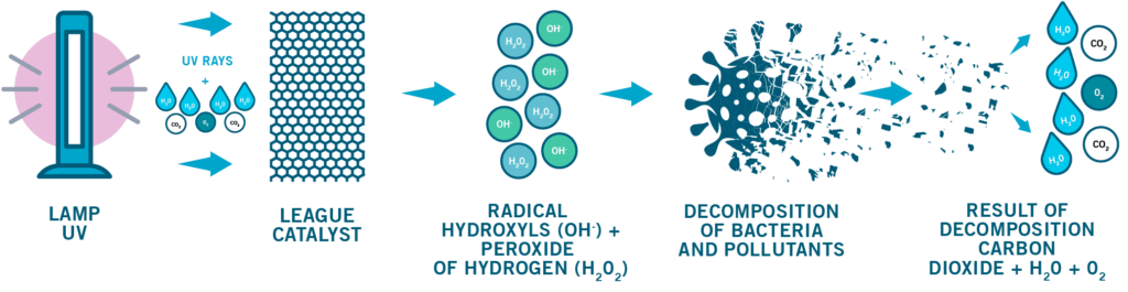La fotocatalisi è un processo fotochimico presente in natura, che consiste nell’azione combinata dei raggi solari UV con alcuni metalli nobili, trasformando parte dell’umidità relativa nell’aria in perossido d’idrogeno, comunemente chiamato acqua ossigenata, la quale trovandosi nella giusta concentrazione sanifica in modo sicuro aria e superfici. La fotocatalisi agisce contro batteri, virus, V.O.C., funghi, muffe, lieviti e odori.